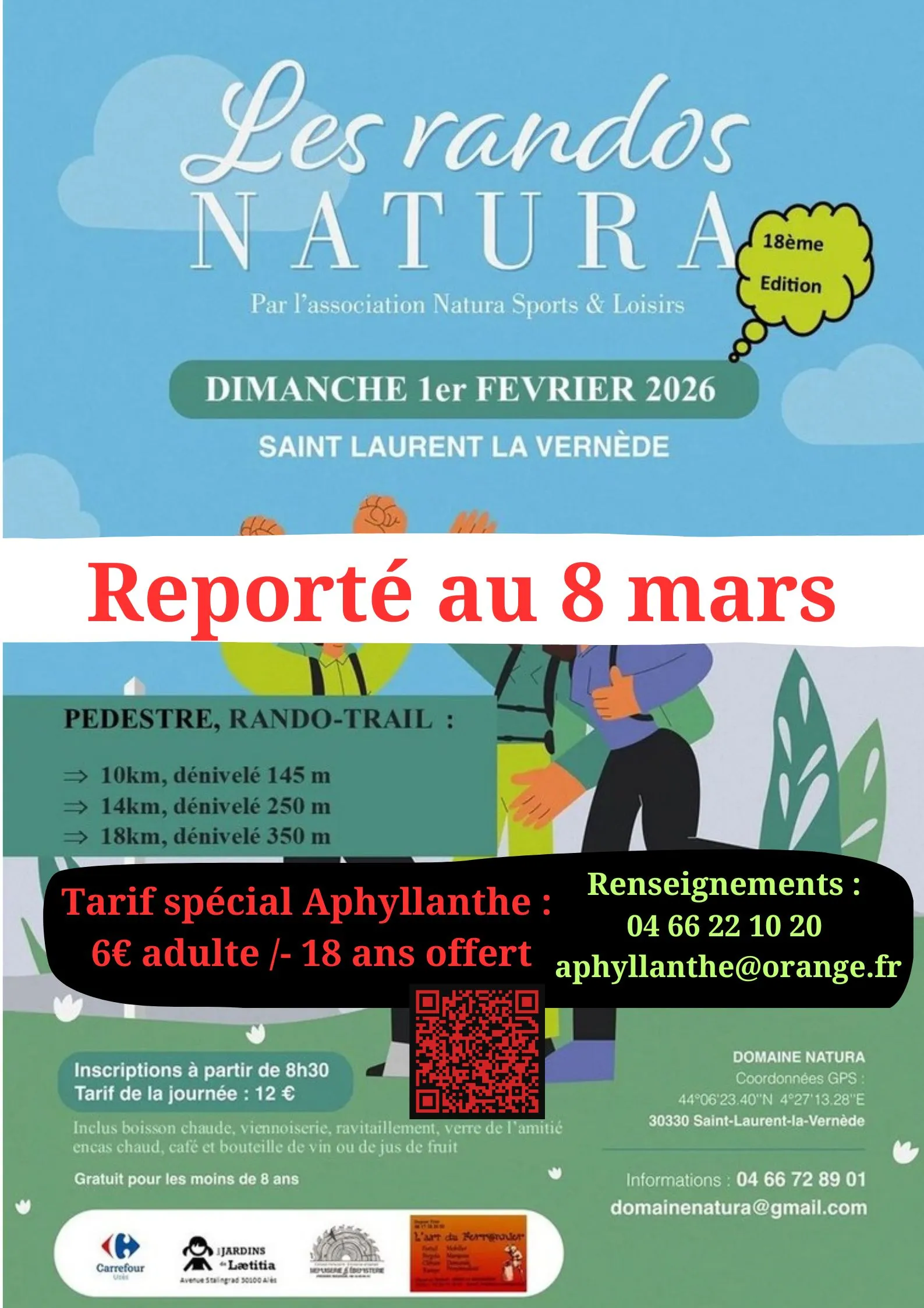 La journée Rando Natura est reportée au dimanche 8 mars pour cause d’intempéries ; les conditions restent identiques.